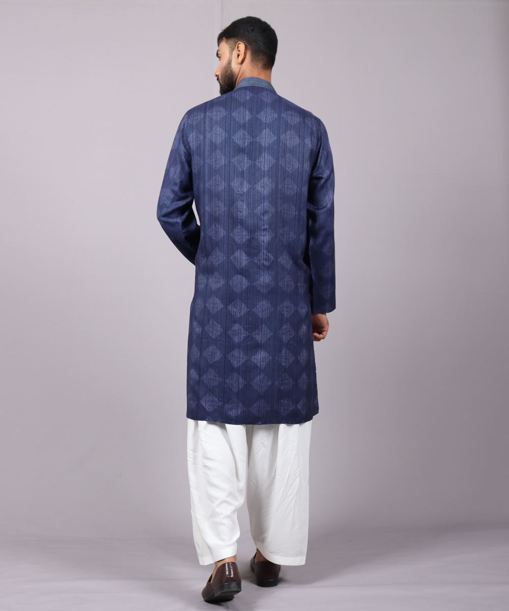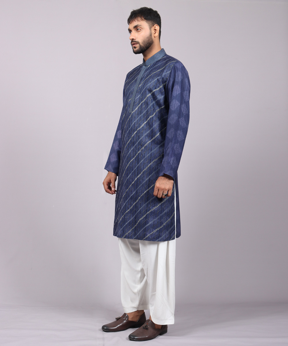 • Navy blue regular cut Panjabi with tie dye print.