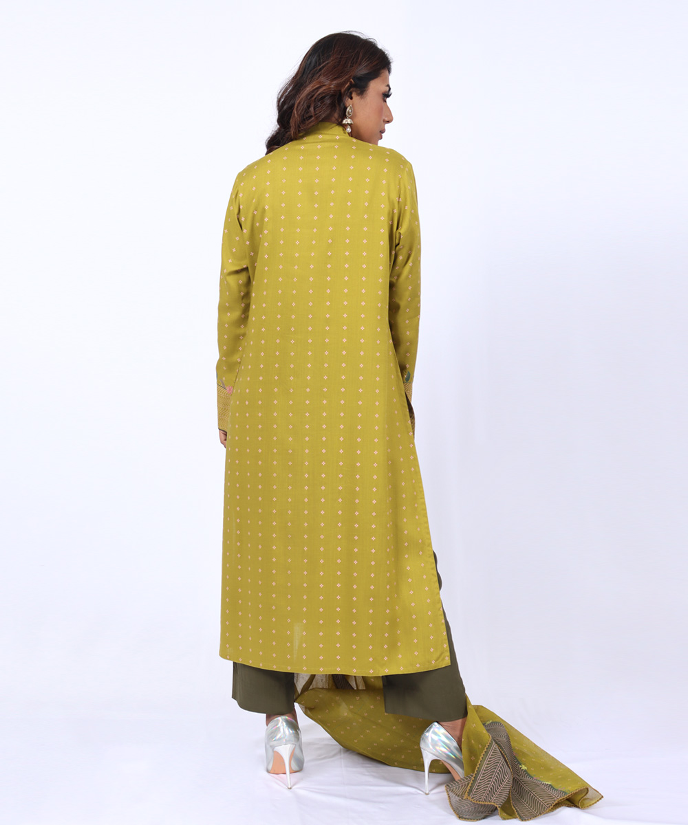 Yellow green printed regular cut kameez with multi colored machine and hand embroidery.