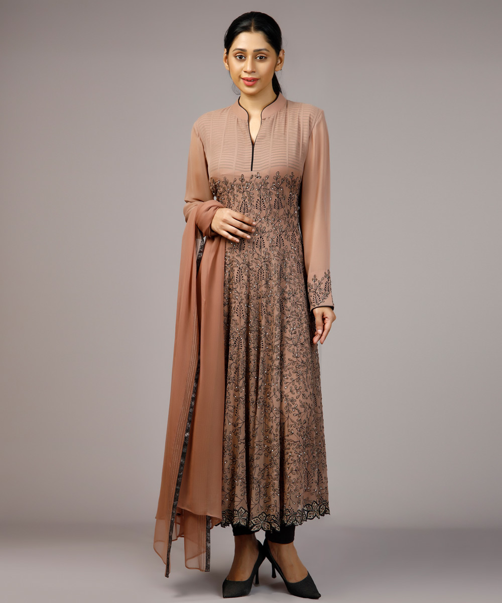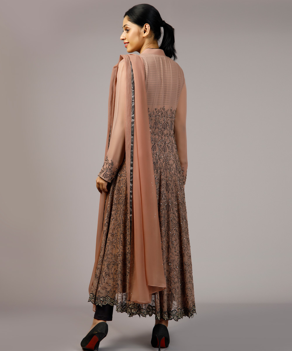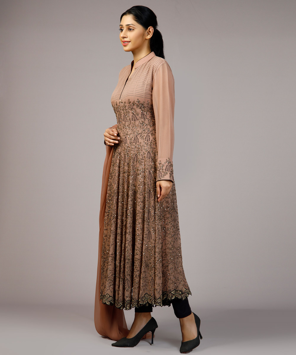 Nude Pink Anarkali set, hand and machine embroidered with sequins.