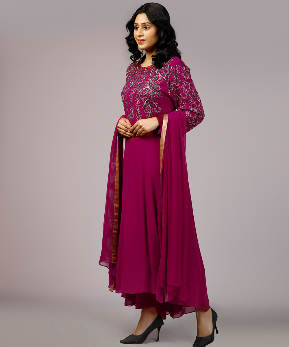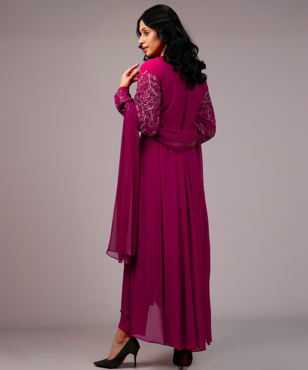 Magenta asymmetrical kameez set, hand and machine embroidery with golden zari and beads.