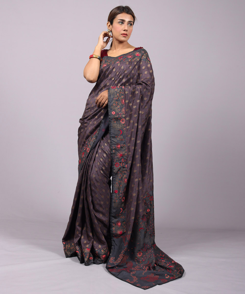 Mauve Cotton silk saree with khari printed body and machine embroidered border.