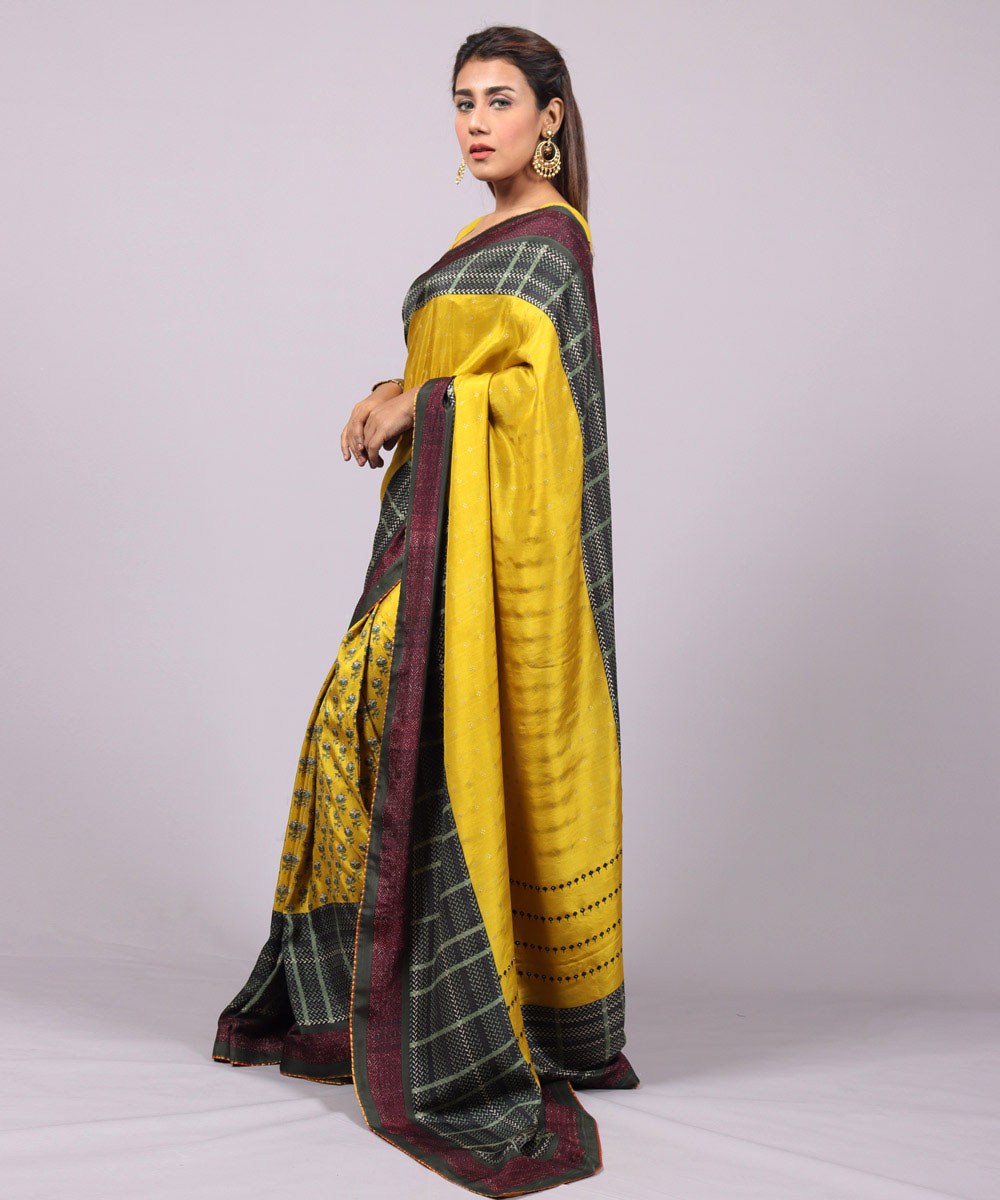 Timeless Habutai silk saree with check border and hand embroidered body.